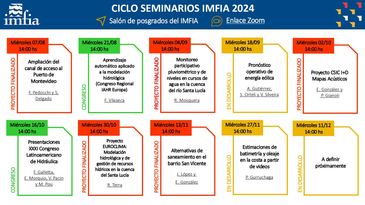 El Instituto de Mecánica de los Fluidos e Ingeniería Ambiental (IMFIA), de la Facultad de Ingeniería, realiza un ciclo de seminarios sobre diversas temáticas de interés local, con una propuesta cada 15 días, los miércoles a las 14 horas en el Salón de Posgrados del IMFIA, o vía zoom para quienes prefieran.