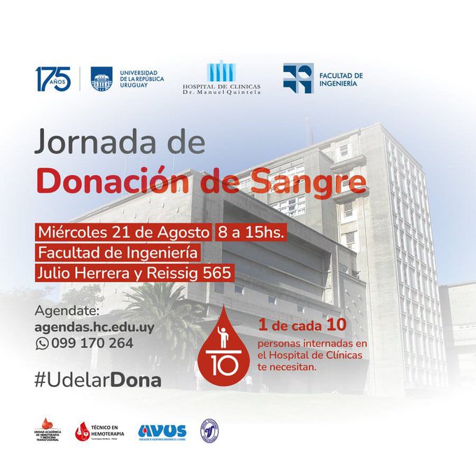 Este miércoles 21 de agosto de 2024 se realizará en Facultad de Ingeniería una jornada de donación de sangre en la planta baja del del edificio Polifuncional José Luis Macera, de 8 a 16 horas.