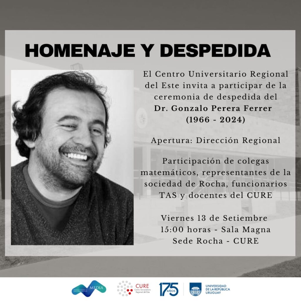 Con profundo pesar, el Centro Universitario Regional del Este (CURE) invita a la comunidad universitaria y al público en general a participar en el homenaje póstumo al Profesor Titular Gonzalo Perera Ferrer, quien falleció recientemente. Perera fue un destacado académico y un referente en el ámbito científico del país.