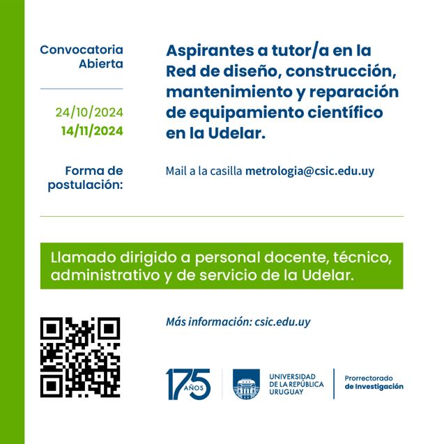 Los prorrectorados de Investigación y Gestión de la Universidad de la República comunican a funcionarios docentes, técnicos, administrativos y de servicio que está abierta la convocatoria a aspirantes para cumplir la función de "Tutor" dentro de la "Red de diseño, construcción, mantenimiento y reparación de equipamiento científico en la Udelar".  Habrá 10 cupos disponibles y el plazo para solicitar el aval en Fing vence el 10 de noviembre.