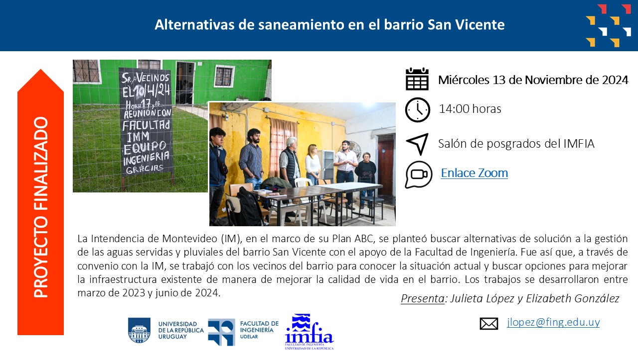 Este miércoles 20 de noviembre de 2024 (nueva fecha) se realizará un nuevo Seminario del IMFIA: Alternativas de saneamiento en el barrio San Vicente, a las 15 horas en el salón de posgrados del IMFIA. Estará a cargo de Julieta López y Elizabeth González en modalidad presencial, aunque también será posible verlo a través de la plataforma zoom.