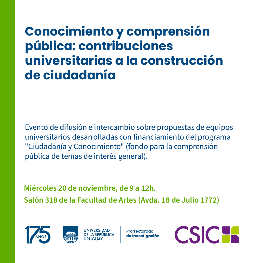 La Comisión Sectorial de Investigación Científica invitamos a participar de la jornada "Conocimiento y comprensión pública: contribuciones universitarias a la construcción de ciudadanía", que se llevará a cabo el próximo miércoles 20 de noviembre, de 9 a 12 horas, en la Facultad de Artes (Avda. 18 de Julio 1772), salón 318. Se trata de una actividad de difusión e intercambio sobre propuestas de equipos universitarios desarrollados con financiamiento del programa Ciudadanía y Conocimiento de la CSIC.