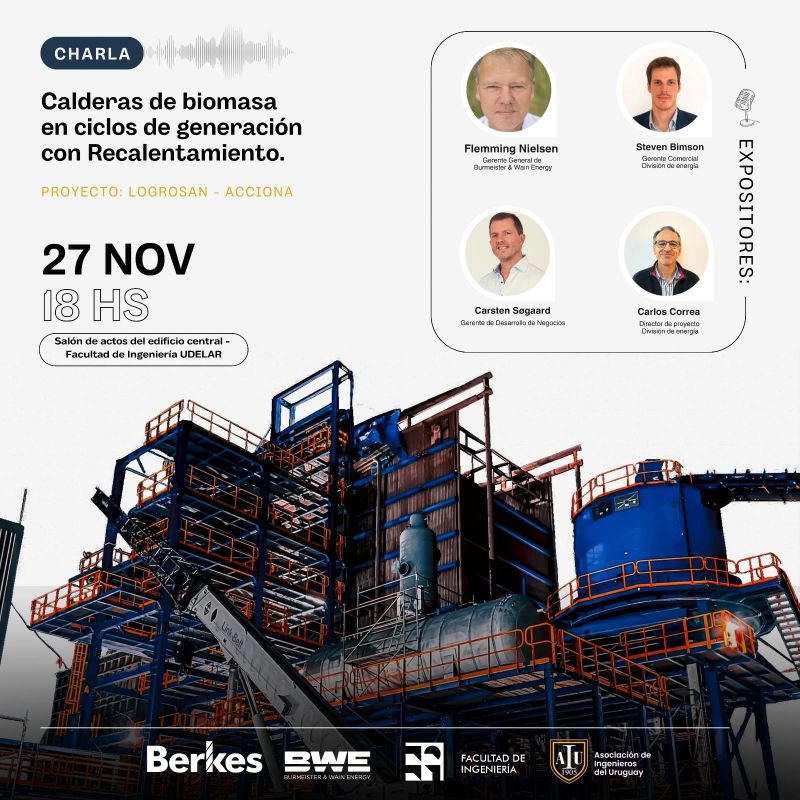 Este 27 de noviembre de 2024 a las 18 horas se realizará en la Facultad de Ingeniería la charla “Calderas de biomasa en ciclos de generación con recalentamiento” por los ingenieros Flemming Nielsen, Steven Bimson Carsten Søgaard y Carlos Correa.