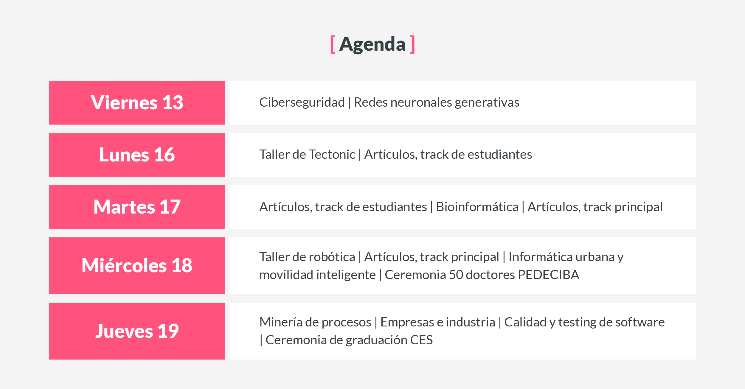 Se realizarán workshops específicos en las temáticas de Ciberseguridad, Redes Neuronales Generativas, Bioinformática, Minería de procesos e Informática urbana y movilidad inteligente. Se realizará también un evento en conmemoración del egreso de los primeros 50 doctores del PEDECIBA Informática y la ceremonia de graduación de los programas profesionales del Centro de Ensayos de Software.