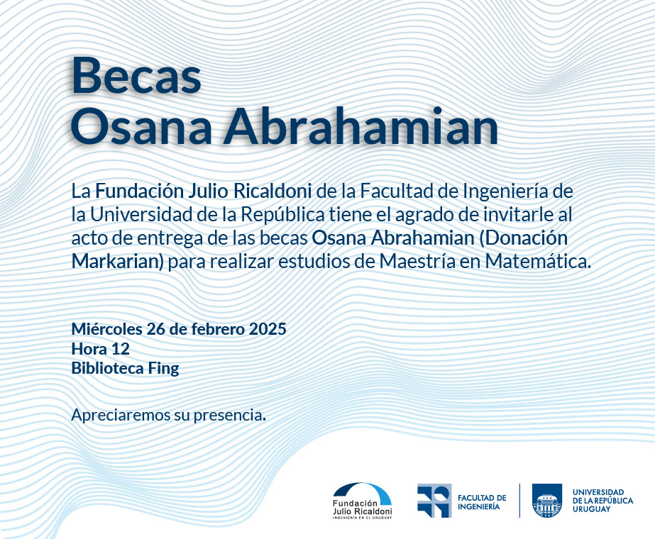 Fundación Ricaldoni tiene el agrado de invitar al acto de entrega de las Becas Osana Abrahamian - Donación Markarian para realizar estudios de Maestría en Matemática en 2025. El mismo se llevará a cabo el miércoles 26 de febrero 2025 a las 12 horas en la Biblioteca de Facultad de Ingeniería. Los estudiantes que obtuvieron las Becas fueron Catarina García Luna, Duberly Gonzalez Molinari y Agustin Duarte.