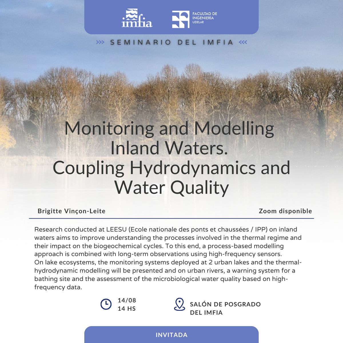 Este 14 de agosto de 2025 tendrá lugar un nuevo Seminario del IMFIA titulado “Monitoring and Modelling Inland Waters – Coupling Hydrodynamics and Water Quality”, presentado por Brigitte Vinçon-Leite (Ecole nationale des ponts et chaussées, Institut Polytechnique de Paris). Será posible asistir de forma presencial o virtual vía zoom.