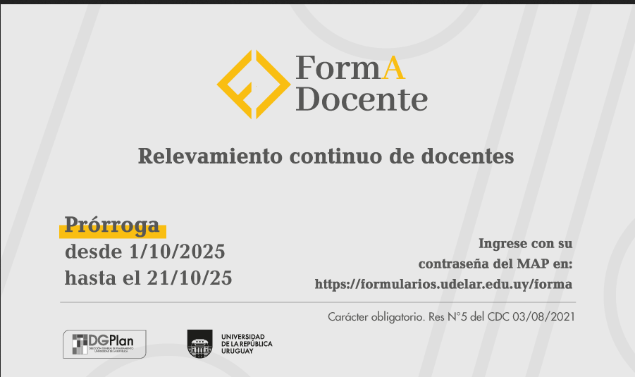 Hasta el 21 de octubre de 2025 se implementa la prórroga de la tercera ronda del relevamiento continuo FormA-Docente, dirigido a toda la población docente y cargos asimilados (becarios/as, pasantes y guardias docentes) de la Universidad de la República.