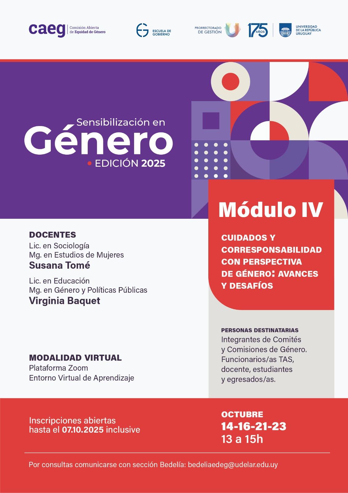• Módulo IV: Cuidados y Corresponsabilidad con perspectiva de género: avances y desafíos. (inscripciones abiertas hasta el 7 de octubre).