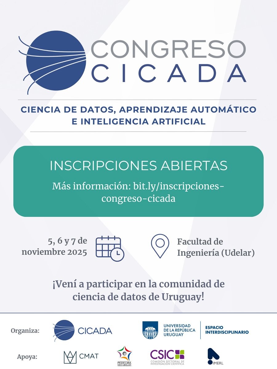 Del 5 al 7 de noviembre de 2025 se realizará en la Facultad de Ingeniería de Udelar el 1er Congreso CICADA: Ciencia de Datos, Aprendizaje Automático e Inteligencia Artificial, reuniendo participantes de la academia, la industria y el gobierno con el objetivo de fortalecer la comunidad nacional; promover la colaboración regional y acercar investigadores en formación a estas metodologías.