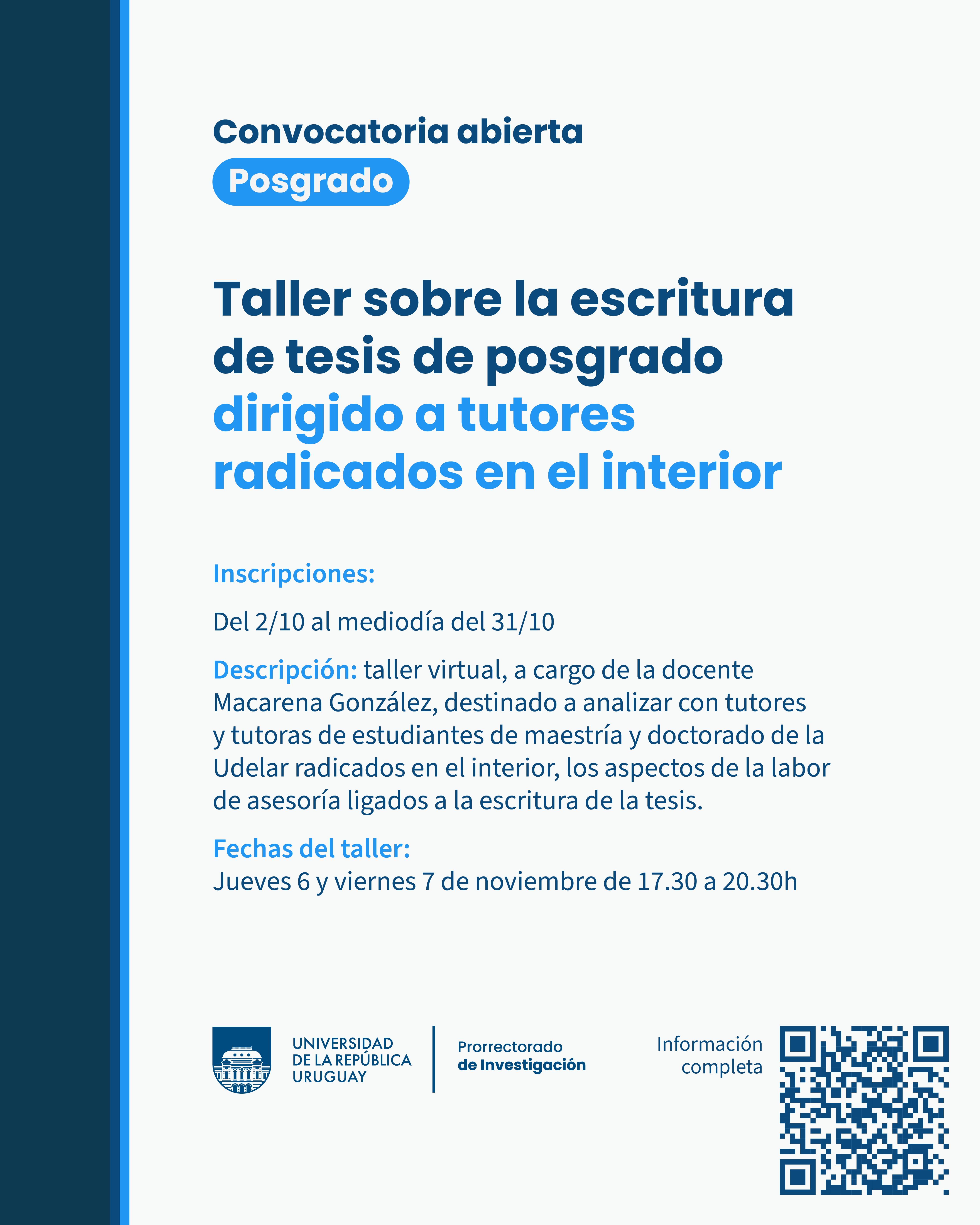 Fuente: https://investigacion.udelar.edu.uy/2025/10/02/abren-inscripciones-para-el-taller-de-asesoria-en-redaccion-de-tesis-de-posgrado-para-tutores-del-interior/