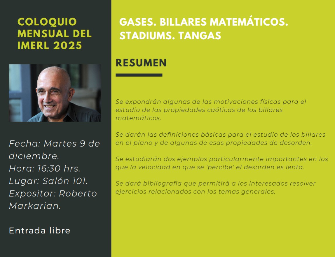 El Profesor Roberto Markarian, ex-Rector y Doctor Honoris Causa de la Udelar, realizará una presentación abierta al público y como cierre del ciclo del Coloquio Mensual del IMERL de 2025; este martes 9 de diciembre a las 16:30 horas en el Salón 101 de la Facultad de Ingeniería.