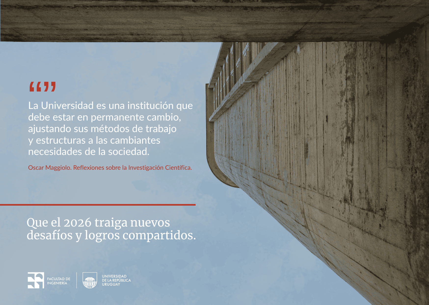 Tomando las palabras de Oscar Maggiolo, cuando nos recordaba que “La Universidad es una institución que debe estar en permanente cambio, ajustando sus métodos de trabajo y estructuras a las cambiantes necesidades de la sociedad”, renovamos al cerrar este año el compromiso de la Facultad de Ingeniería con una Universidad pública dinámica, crítica y profundamente vinculada con el entorno.