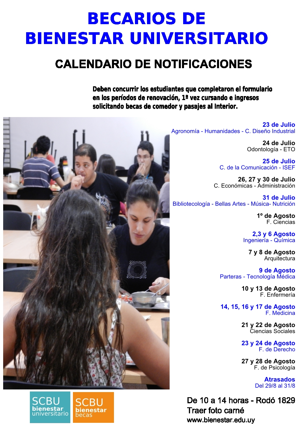 Las resoluciones de Becas son confidenciales, se entregan personalmente en el Área de Becas de Bienestar -Rodó 1829 - de 10 a 14h para lo cual está vigente un Calendario de notificación según el Centro de Estudios.