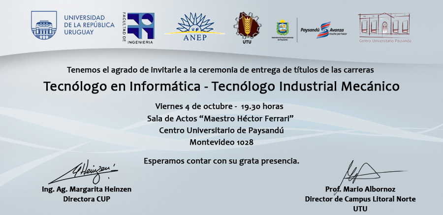 Este viernes 4 de octubre, a las 19.30 horas, se desarrollará el acto de colación de grado de estudiantes de Tecnólogo en Informática y Tecnólogo Mecánico. La misma se desarrollará en la sala de actos Maestro Héctor Ferrari, ubicada en el Centro Universitario de Paysandú.