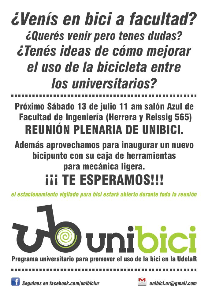 El Programa Unibici invita a su próxima reunión de información y planificación el Sábado 13 de Julio a las 11:00 h en la Facultad de Ingeniería , Julio Herrera y Reissig 565, salón Azul (3er. piso).