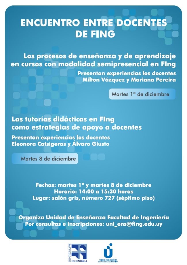 Horario: 14 a 15:30 hs Lugar: Salón Gris número 727 (séptimo piso)Martes 8 de diciembre "Las tutorías didácticas en FIng como estrategias de apoyo a docentes"