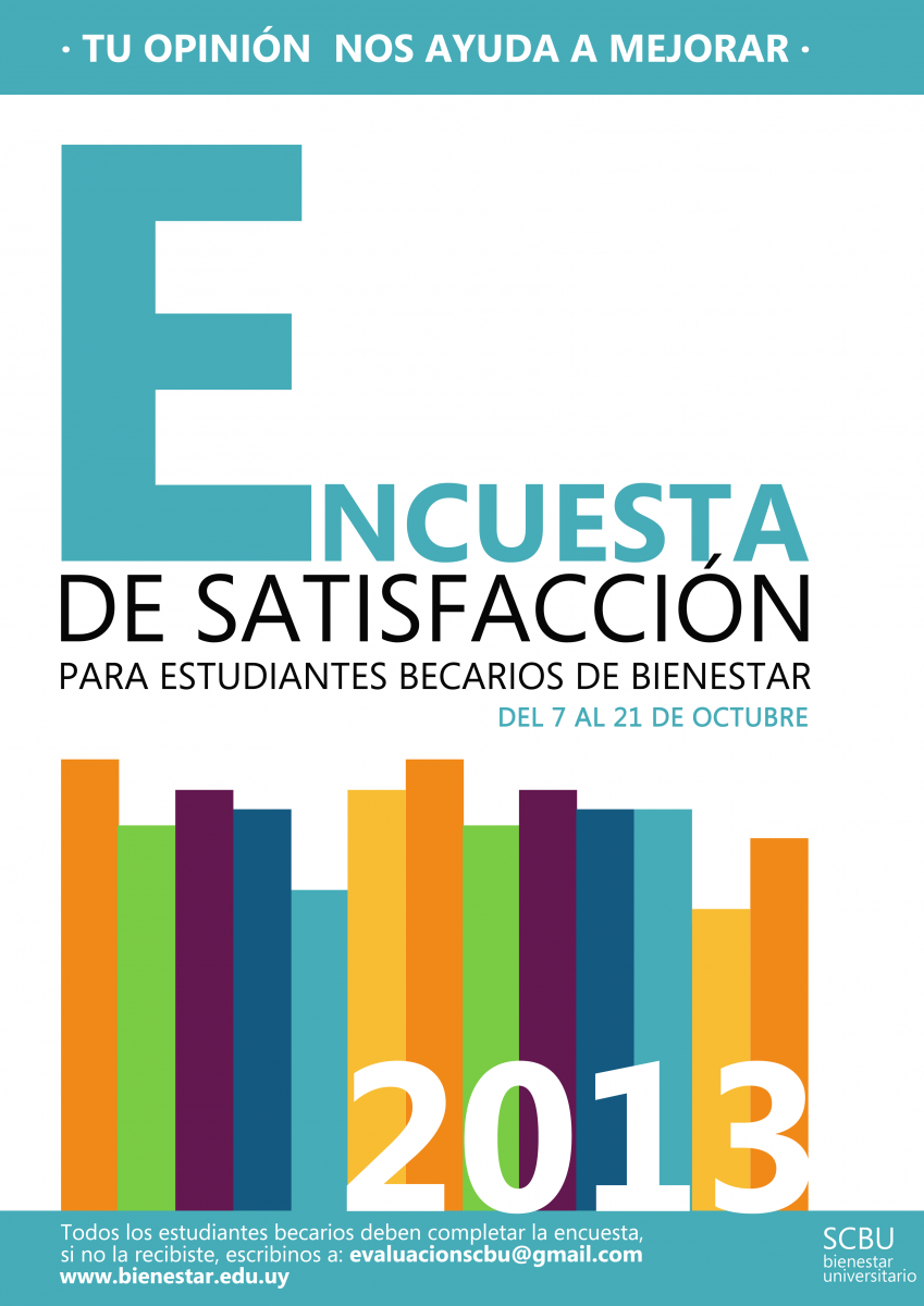 El Servicio Central de Bienestar Universitario lanza la Encuesta de Satisfacción, dirigida a TODOS LOS ESTUDIANTES BECARIOS DE BIENESTAR, con el objeto de conocer su opinión acerca del Servicio y de las prestaciones que ofrece, y así, seguir mejorando la oferta de prestaciones y el funcionamiento del Servicio.