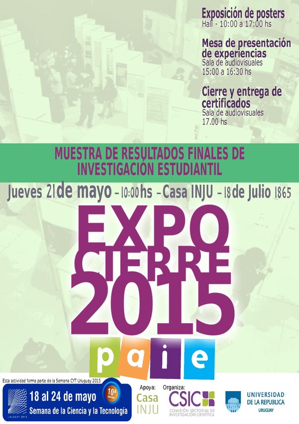 El jueves 21 de mayo de 2015 de 10 a 17 hs se llevará a cabo la Expo Cierre 2015, muestra de resultados finales de proyectos de investigación estudiantil de todo el país, financiados por el Programa de Apoyo a la Investigación Estudiantil en su edición 2013.