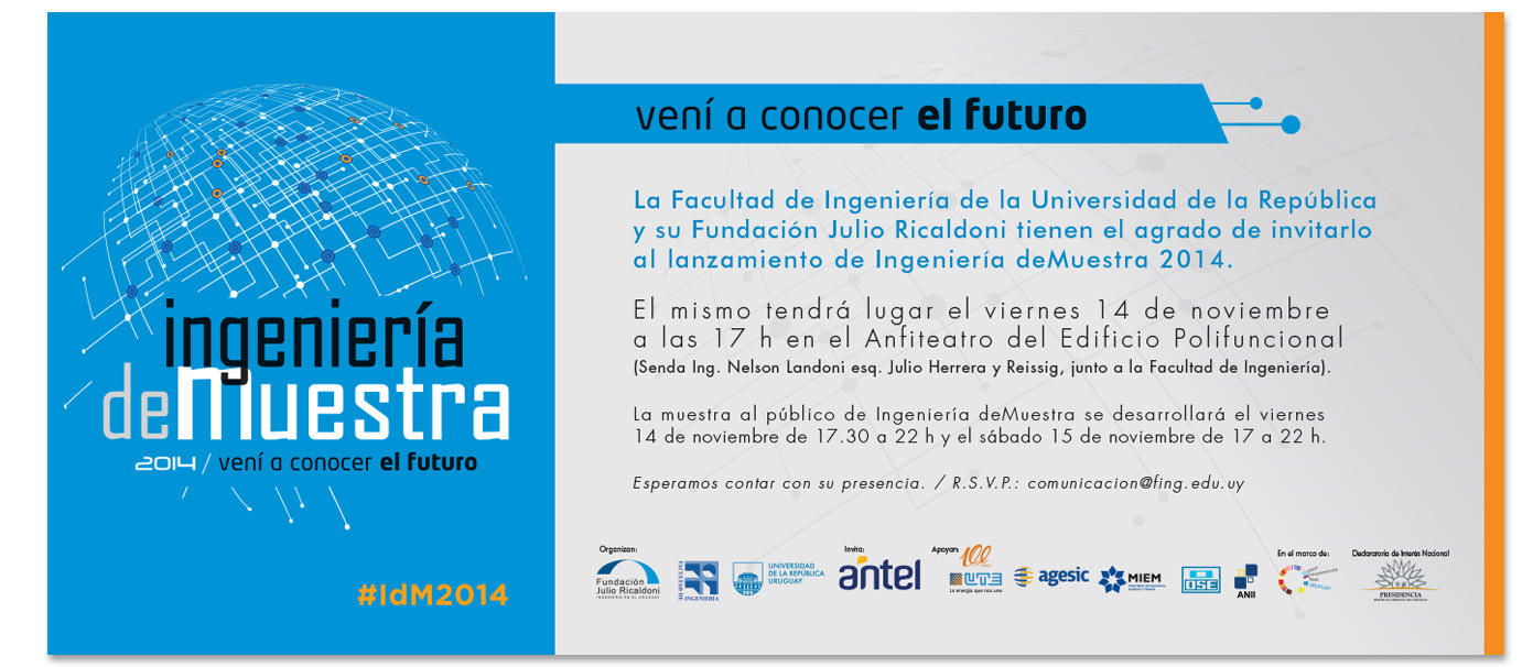 Organizada por la Facultad de Ingeniería de la Universidad de la República y su Fundación Julio Ricaldoni, esta muestra interactiva de proyectos tecnológicos se desarrollará en el predio de la facultad con entrada libre y gratuita. Podés unirte al evento en Facebook e invitar a tus amigos a participar, o twittear con el hashtag #IdM2014.