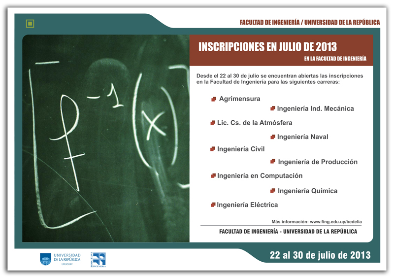 Las inscripciones se realizarán los días 22 y 23 julio y desde el 26 al 30 julio 2013 (de lunes a viernes de 8 a 12 hs). No se tomarán inscripciones los días 24 y 25 de julio debido a las medidas gremiales establecidas en el marco de la Rendición de Cuentas.