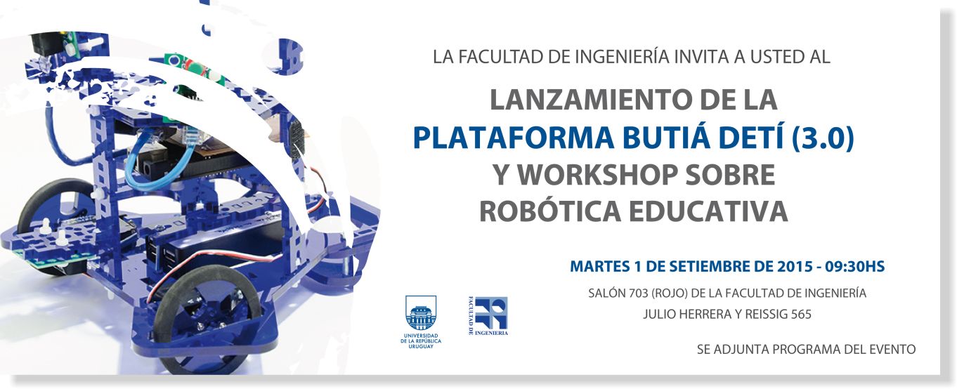 El próximo martes 1 de septiembre se realizará en la Facultad de Ingeniería de la Udelar el Lanzamiento de la Plataforma Butiá Detí (3.0) y Workshop sobre Robótica Educativa de 09:30 a 13:30 hs en el salón 703 (rojo) de la Facultad.