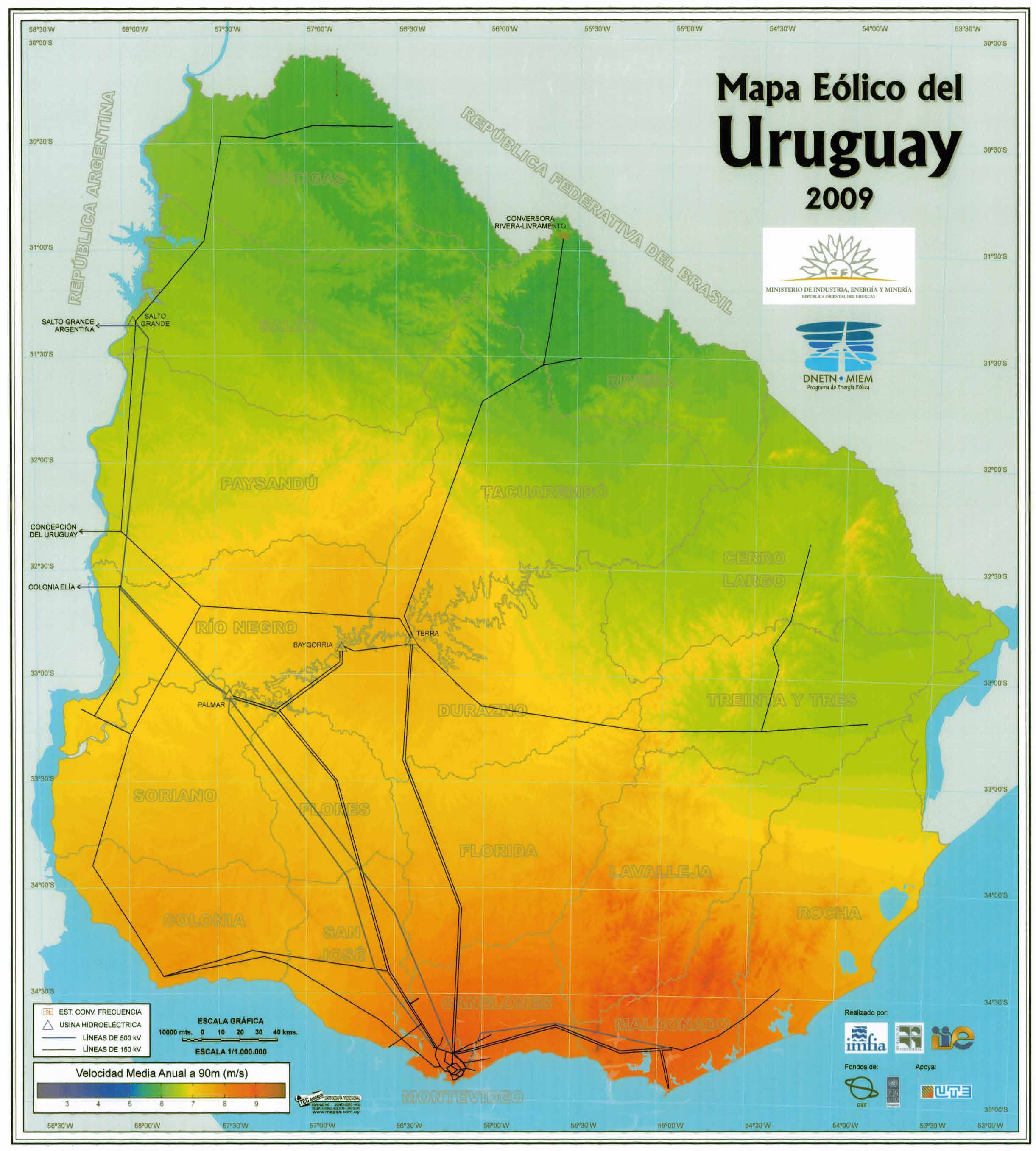 El mapa eólico constituye un primer avance sobre la prospección del recurso eólico en el país. Fue desarrollado por la Facultad en el año 2009, a través de un convenio con el Programa de Energía Eólica de Uruguay (PEEU). Su confección permite la visualización del clima de vientos en todo el territorio, dando lugar a la identificación de zonas con mayor recurso y a la caracterización del clima de vientos. Desde 2011 se vienen implementando los modelos de predicción operativa del recurso eólico para todos los parques eólicos instalados en Uruguay.