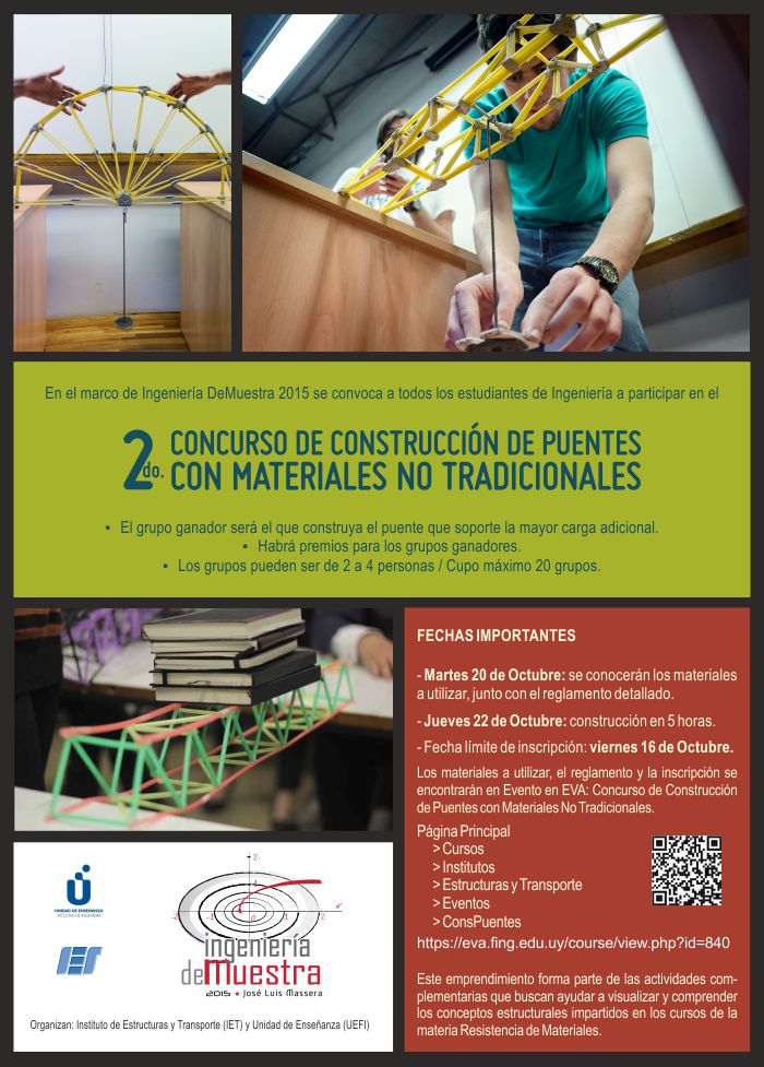 En el marco de Ingeniería deMuestra 2015, el Instituto de Estructuras y Transporte (IET) convoca a todos los estudiantes de Ingeniería a participar del «Segundo Concurso de Construcción de Puentes con Materiales no Tradicionales».