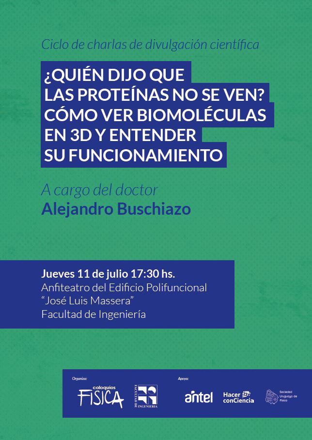 Los Coloquios de Física nos traen la charla “¿Quién dijo que las proteínas no se ven? Cómo ver biomoléculas en 3D y entender su funcionamiento” el jueves 11 de julio en el Anfiteatro del Edificio Polifuncional "Jose Luis Massera" a cargo del Dr Alejandro Buschiazzo.