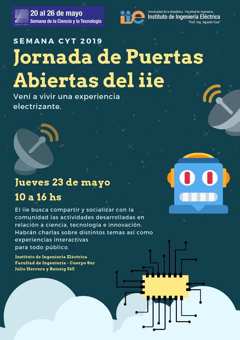 El jueves 23 de mayo la Facultad ofrecerá una Jornada de Puertas abiertas, donde el IIE estará participando con charlas para niños y jovenes sobre la Ingeniería Eléctrica y en Agrimensura se recibirán grupos para conocer sobre las carreras, muestra de instrumental y del software asociado a esa rama de la Ingeniería. La jornada contará con charlas de media hora y experiencias interactivas.