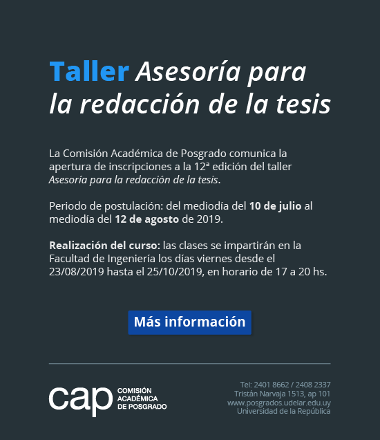 Están abiertas las inscripciones a la 12º edición del taller “Asesoría para la redacción de la tesis”. Las postulaciones cierran el 12 de agosto de 2019 al mediodía.