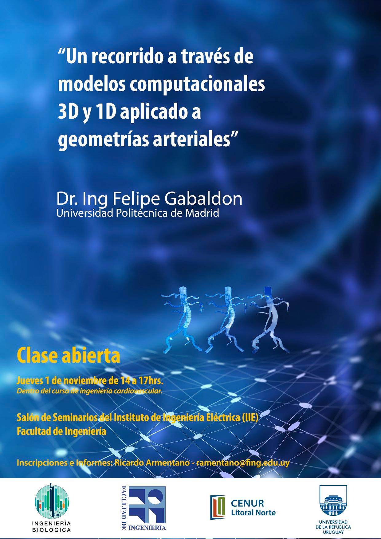 El jueves 1º de noviembre se realizará la clase abierta "Un recorrido a través de modelos computacionales 3D y 1D aplicado a geometrías arteriales" a cargo del Dr. Ing. Felipe Gabaldón de la Universidad Politécnica de Madrid.