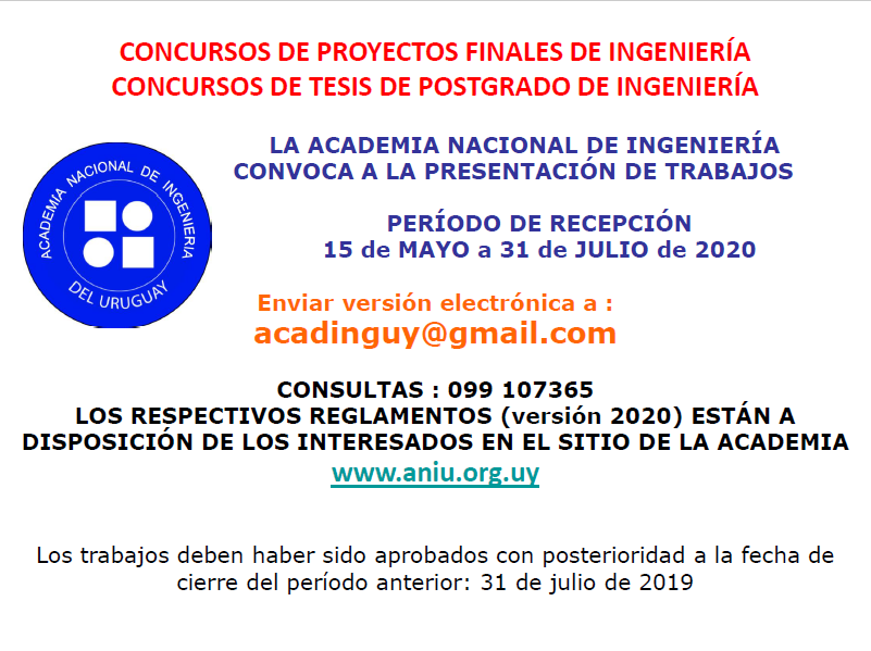 La Academia Nacional de Ingeniería el pasado 15 de mayo de 2020 abrió su convocatoria a los concursos anuales de Proyectos Finales de Ingeniería y Tesis de Posgrado de Ingeniería, cuyo objetivo es fomentar y apoyar el desarrollo de investigaciones de calidad, con contenidos innovadores y vinculados a la realidad nacional en cualquiera de las áreas de la Ingeniería.