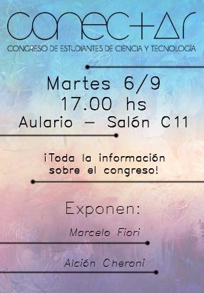 Este martes 6 de setiembre a las 17hs en el salón C11 del aulario, habrá un encuentro para las personas interesadas en participar del CONECTAR 2016: Congreso de Estudiantes de Ciencia y Tecnología Argentina (La Plata, Argentina). La instancia es para todos aquellos que estén interesados, se hayan inscripto o no al congreso.
