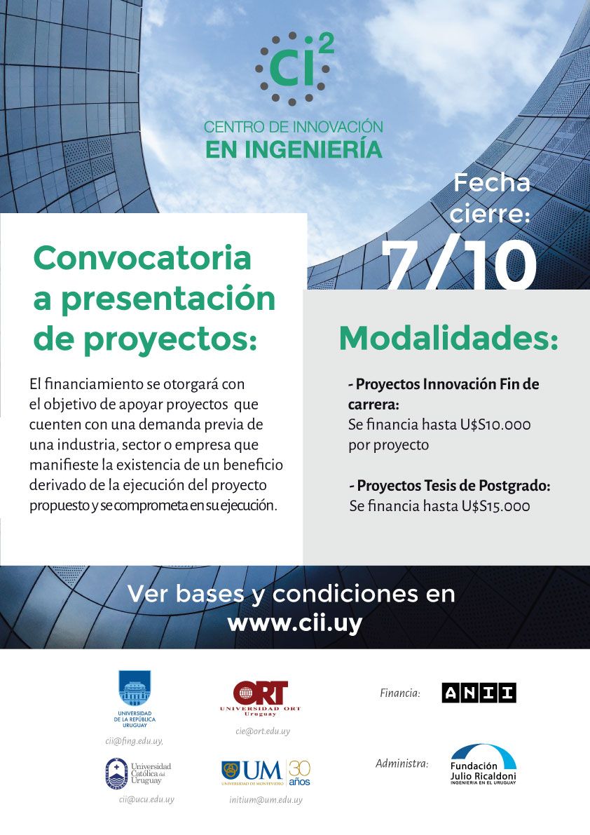 El Centro de Innovación en Ingeniería (CII) abre un nuevo llamado para financiación de proyectos de grado y postgrado. El plazo para presentar las propuestas se extendió hasta el lunes 17 de octubre de 2016.