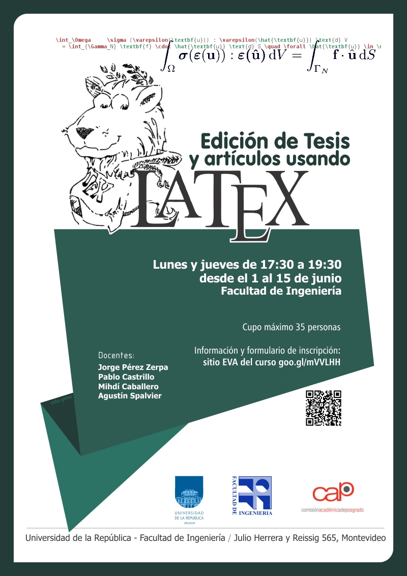 Están abiertas las inscripciones para la nueva edición del curso de posgrado/actualización "Edición de Tesis y Artículos usando LaTeX". El curso será dictado en la Facultad de Ingeniería del 1 al 15 de junio en coordinación y con el apoyo de la Comisión Académica de Posgrado de la Universidad de la República (Udelar).