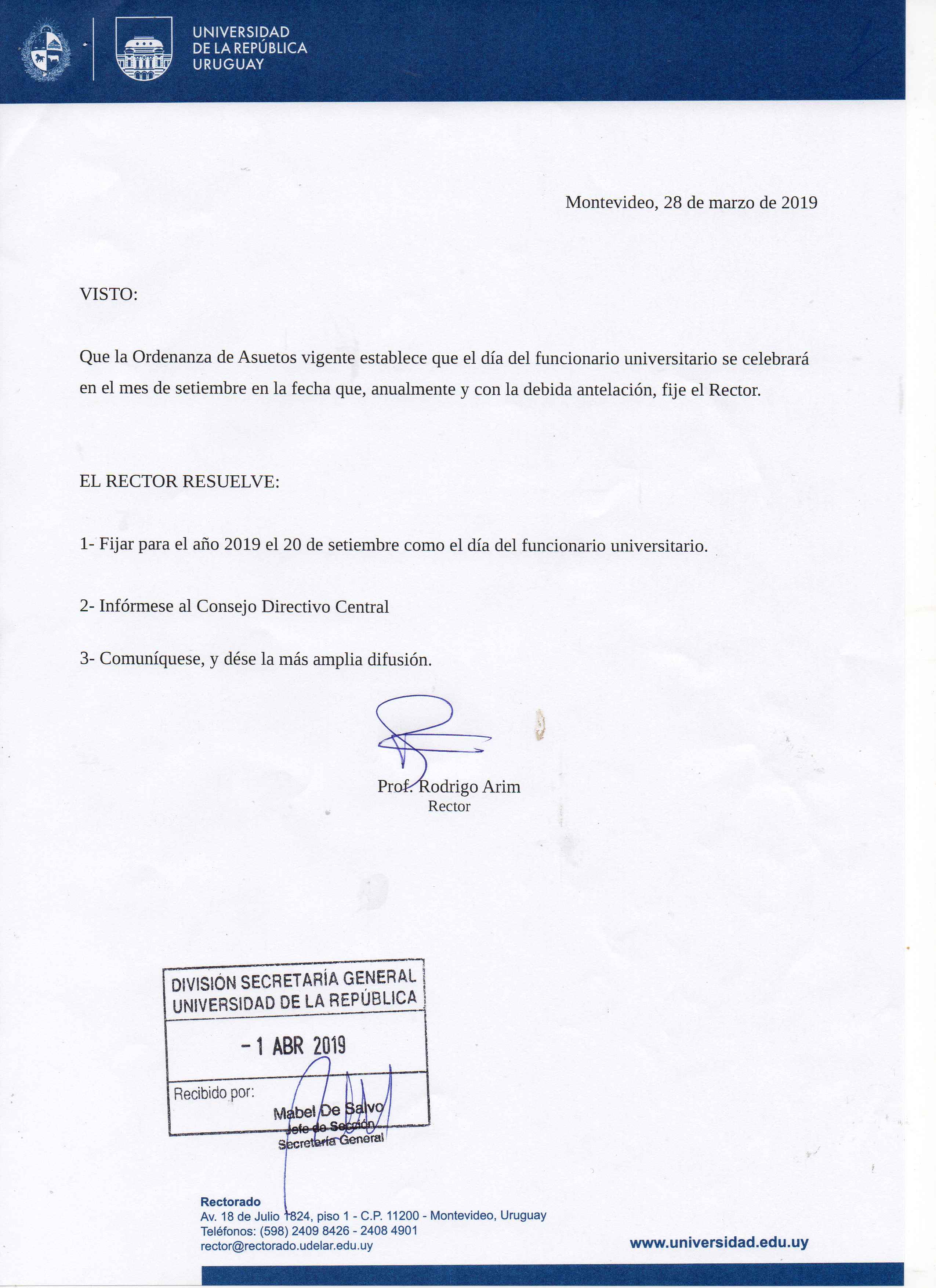 Adjuntamos la resolución adoptada por el rector de la Universidad de la República, Rodrigo Arim.