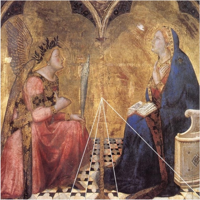 Ambrogio Lorenzetti pintó en 1344 una célebre Anunciación [1]. De acuerdo con la tradición, representa a la Virgen (a la derecha, sentada, interrumpida en su lectura) y al Ángel (a la izquierda, arrodillado, con una palma en la mano) en un mismo espacio definido por un suelo en damero que se abre sobre un fondo de oro, separado en dos por una columna vertical. Las líneas del damero (resaltadas en blanco en la figura de abajo) [2] convergen sin dificultad hacia el punto de fuga : el artista parece por lo tanto respetar la regla de convergencia de las ortogonales proyectadas, y el espectador es invitado a tomar posición según ese punto para mirar el cuadro. Todo se arruina cuando el observador quiere definir a qué distancia del cuadro debe colocarse para que calcen correctamente los efectos de la perspectiva : efectivamente, los vértices superiores derechos de los cuadrados diagonales del suelo no están alineados.