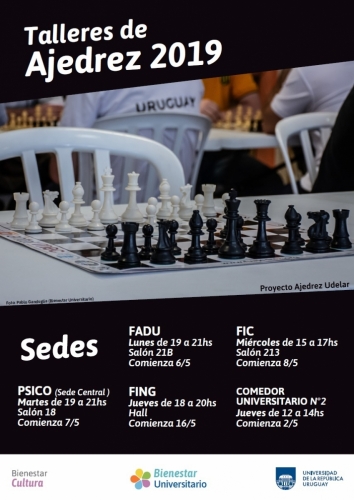 En mayo inician los talleres de Ajedrez Udelar en cinco sedes universitarias: Facultad de Arquitectura y Diseño y Urbanismo (FADU), Facultad de Información y Comunicación (FIC), Facultad de Psicología, Facultad de Ingeniería y Comedor Universitario nº 2.
