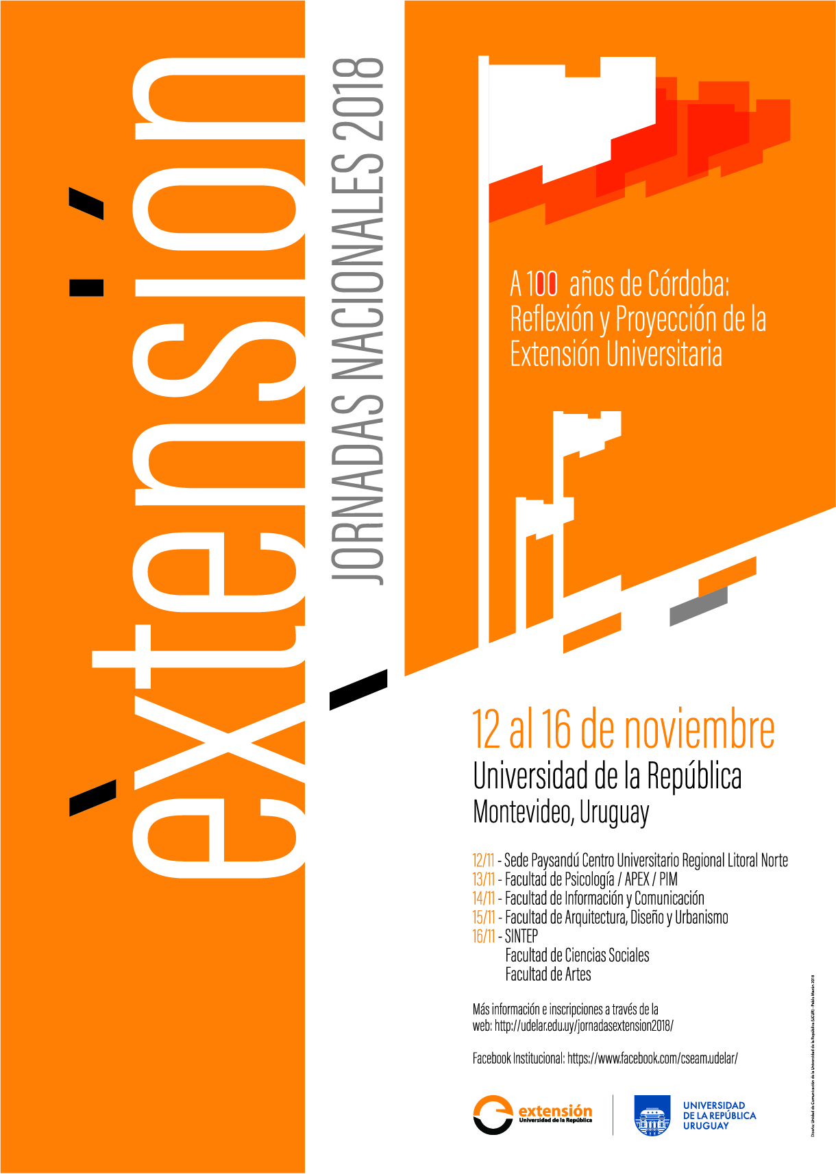 Las Jornadas Nacionales de Extensión 2018, se llevarán adelante entre el 12 y el 16 de noviembre de 2018 con sede en diferentes servicios de la Universidad de la República.