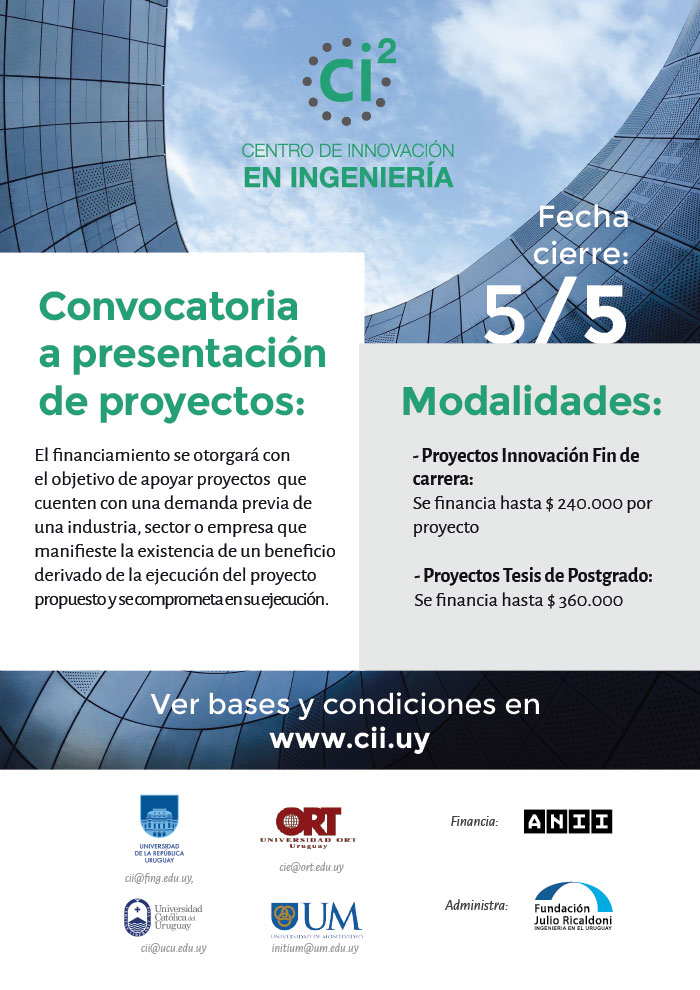 El Centro de Innovación en Ingeniería (CII) lanzó su quinto llamado a financiación de proyectos de grado de estudiantes de Ingeniería, a través del cual otorgará un apoyo de hasta $ 240.000 a cada iniciativa seleccionada. Asimismo, abrió su segunda convocatoria a financiamiento de tesis de posgrado de Facultad de Ingeniería, que costeará hasta $ 360.000 por proyecto.