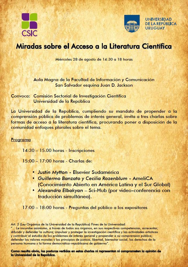 El miércoles 28 de agosto de 14.30 a 18.00 horas en el Aula Magna de la Facultad de Información y Comunicación, se llevará a cabo la actividad organizada por CSIC "Miradas sobre el Acceso a la Literatura Científica", con la participación de: