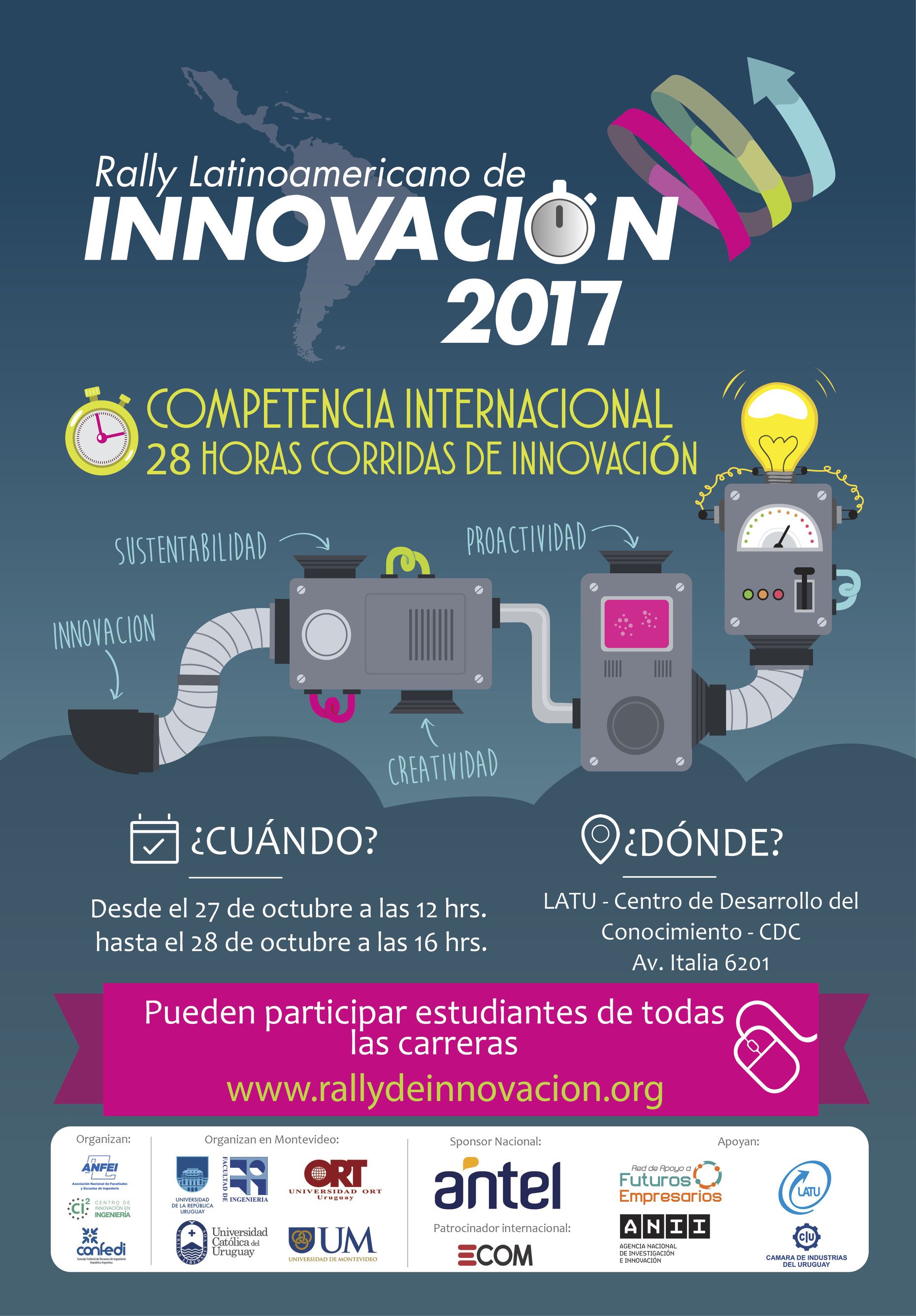 El “Rally Latinoamericano de Innovación” es una competencia internacional por equipos que tiene como propósito fomentar la innovación abierta en las facultades y escuelas de ingeniería de Latinoamérica y que se desarrolla durante 28 horas consecutivas y en simultáneo en todas las sedes de los países participantes. La competencia se llevará a cabo durante los días 27 y 28 de octubre 2017.