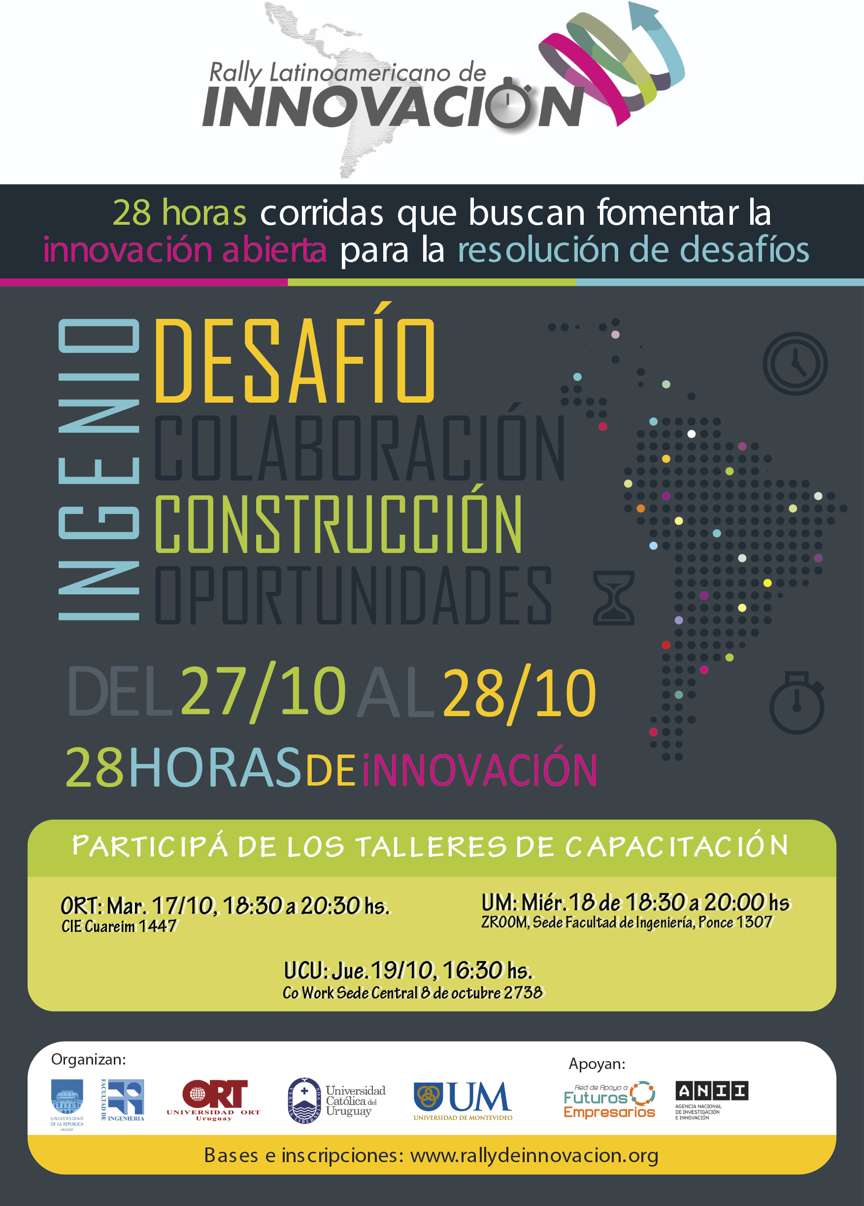 El “Rally Latinoamericano de Innovación” es una competencia internacional por equipos que tiene como propósito fomentar la innovación abierta en las facultades y escuelas de ingeniería de Latinoamérica y que se desarrolla durante 28 horas consecutivas y en simultáneo en todas las sedes de los países participantes. La competencia se llevará a cabo durante los días 27 y 28 de octubre 2017.