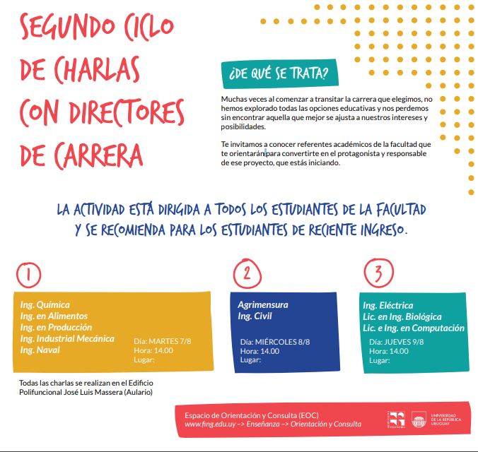 Desde el martes 7 al jueves 9 de agosto se realizará el Segundo ciclo de charlas con Directores de Carrera. La actividad está dirigida a todos los estudiantes de la facultad y se recomienda para los estudiantes de reciente ingreso.