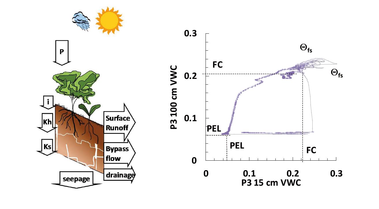 La humedad del suelo es un importante control de la función hidrológica, ya que regula los flujosverticales desde y hacia la atmósfera, la recarga del agua subterránea y los flujos laterales a través delsuelo. Históricamente, los parámetros del modelo tradicional de saturación, capacidad de campo y puntode marchitamiento permanente se han determinado mediante métodos de laboratorio. Este enfoque escuestionado por cuestiones de escala, condiciones de frontera y perturbación del suelo. Desarrollamos y comparamos cuatro métodos para determinar los valores de saturación de campo, capacidad de campo, límite de extracción de la planta (PEL) e iniciación del estrés hídrico de la planta a partir de registros de monitoreo in situ a largo plazo de contenido de agua volumétrico medido por TDR. Los sitios de monitoreo representan una gama de texturas del suelo, profundidades del suelo, precipitación efectiva y tipos de cobertura vegetal en un clima semiárido. Los registros exhiben atractores (valores de alta frecuencia) que corresponden a la capacidad de campo ya la PEL en escalas anuales y de mayor duración, pero los valores de saturación de campo varían según el año dependiendo de la humedad estacional en el semiárido. El análisis de cinco sitios en dos cuencas se apoya en comparación con los valores eterminados por una función de pedotransferencia común y medido curvas características del suelo. El suelo congelado se identifica como un factor de complicación para el análisis y se advierte a los usuarios que filtran datos por temperatura, especialmente para suelos cercanos a la superficie.