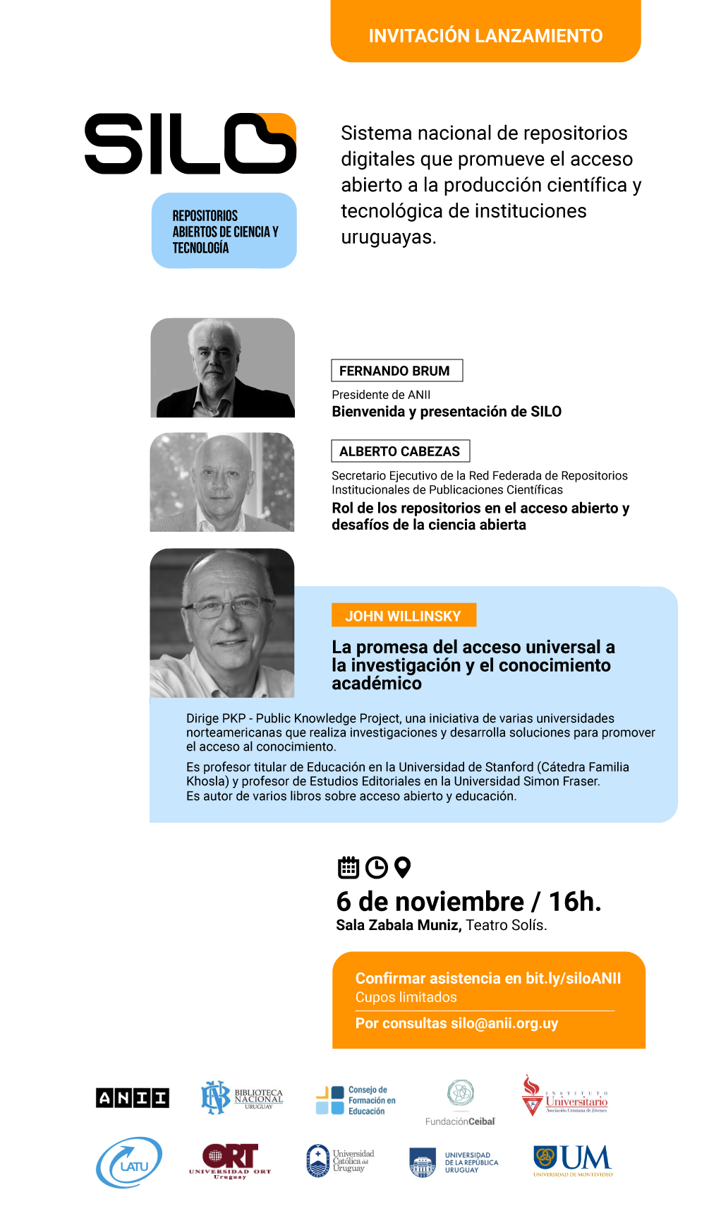 La Agencia Nacional de Investigación e Innovación realizará el lanzamiento de "SILO: Repositorios abiertos de ciencia y tecnología", el miércoles 6 de noviembre a las 16h en la sala Zavala Muniz del Teatro Solis. Hablarán Fernando Brum (ANII), Alberto Cabezas (LA Referencia) y John Willinski (Public Knowledge Project).