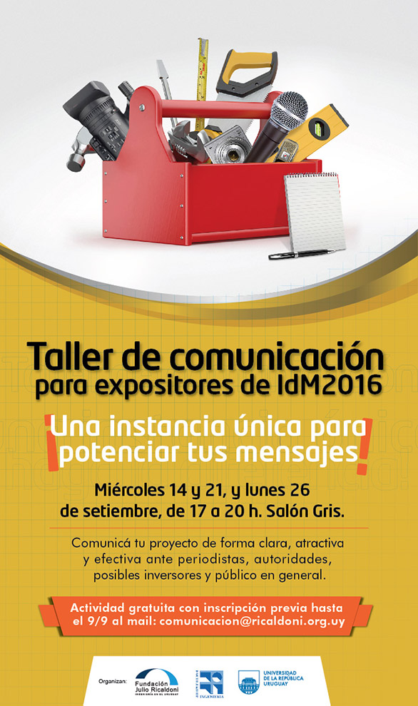 En 2015, más de 5000 personas visitaron Ingeniería deMuestra y unos 40 medios de comunicación se hicieron eco del evento. Si este año serás uno de los expositores y querés presentar tu proyecto de forma clara y atractiva ante los distintos públicos de la muestra (periodistas, autoridades, posibles inversores y público en general), inscribite al taller de comunicación.