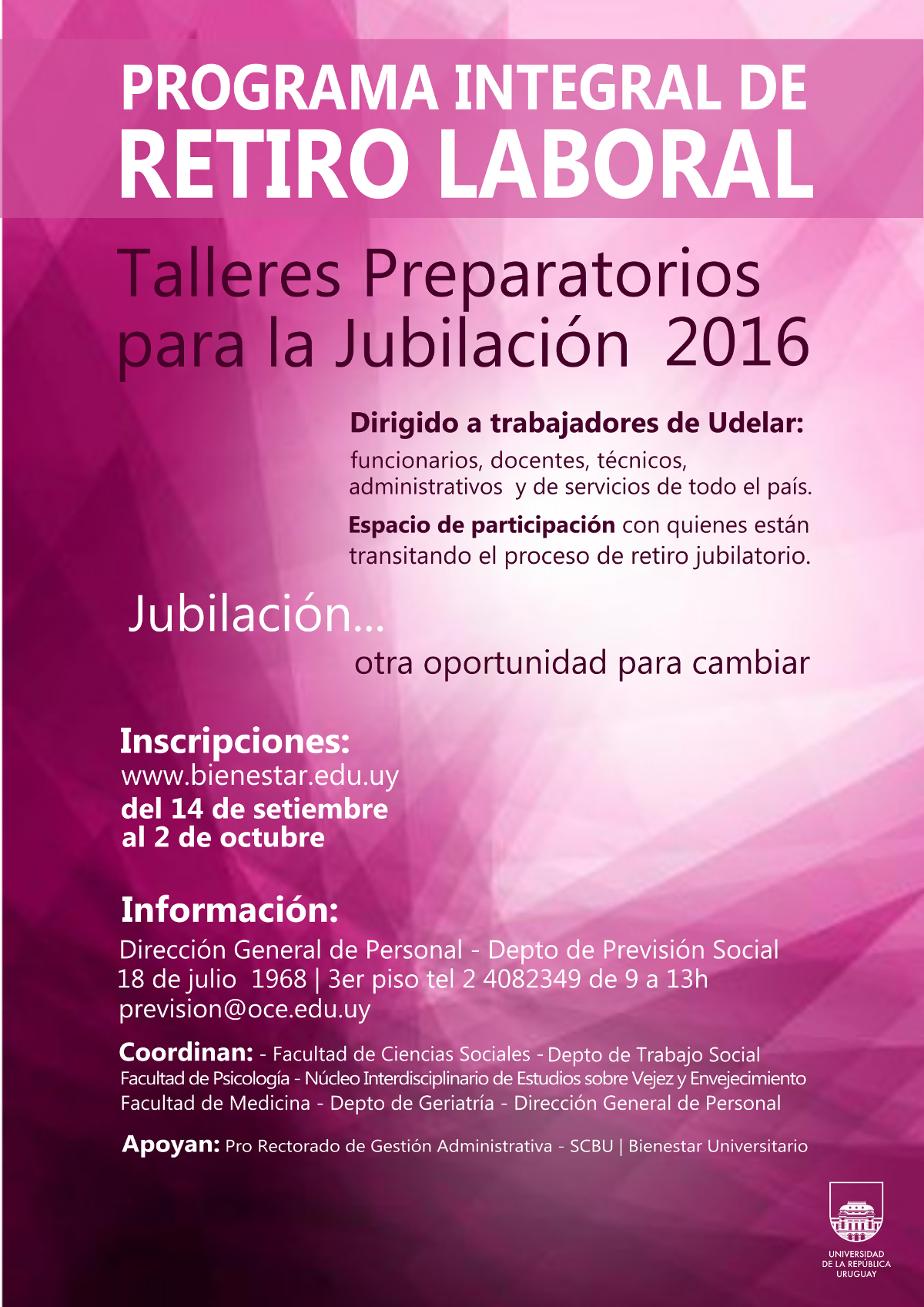El Programa Integral de Retiro Laboral de la Universidad de la República implementará una serie de talleres Preparatorios para la Jubilación con el objetivo de apoyar a los funcionarios universitarios en el tránsito hacia su retiro.