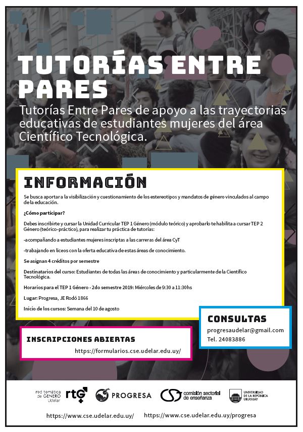 Las Tutorías Entre Pares son desarrolladas por el Programa de Respaldo al Aprendizaje (Progresa) y en este caso apoyadas desde la Red de Género de la Udelar. Tienen como fin acompañar a estudiantes que se inscriben a las carreras del área científico-tecnológica para mejorar su permanencia y adaptación en la misma.