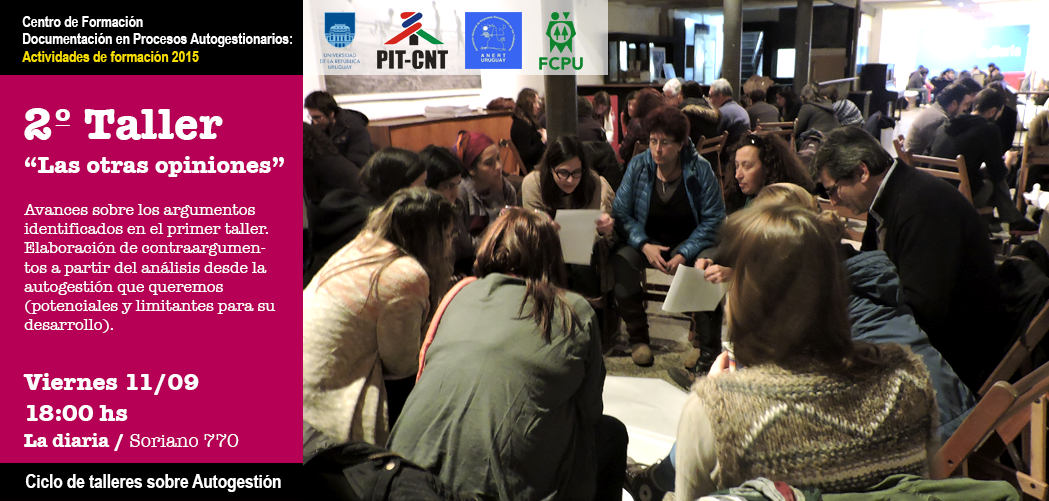 El próximo viernes 11 de setiembre a las 18 hrs en La Diaria (Soriano 770) se realizará el segundo taller del ciclo "Debate sobre Autogestión",  denominado "Segundas opiniones".En dicha instancia se propondrá pensar los limitantes y las potencialidades de la autogestión para el desarrollo de nuestro país.